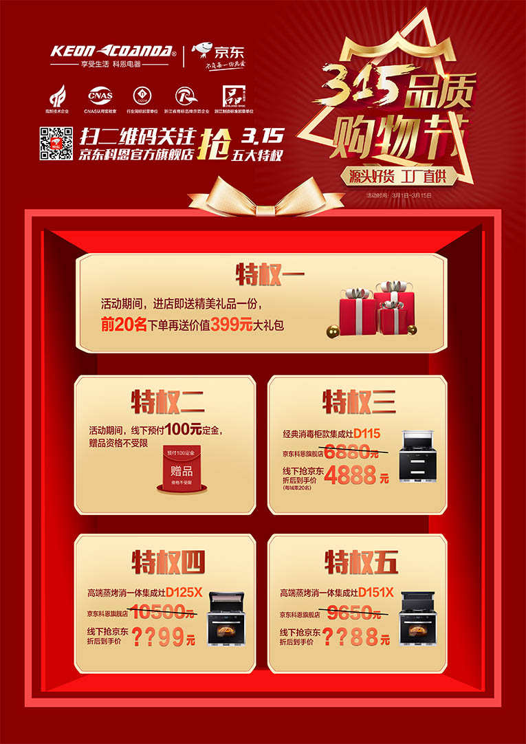 集成灶十大品牌、廚電行業(yè)十大品牌科恩電器315品質(zhì)購(gòu)物節(jié),3月1日至3月15日活動(dòng)期間,關(guān)注京東科恩官方旗艦店搶3.15五大特權(quán)!特權(quán)一:凡進(jìn)店客戶,即送精美禮品一份,前20名下單再送價(jià)值399元大禮包;特權(quán)二:活動(dòng)期間線下預(yù)付100元定金,贈(zèng)品資格將不受限;特權(quán)三:經(jīng)典消毒柜款集成灶D115京東科恩旗艦店6880元,線下?lián)尵〇|折后到手價(jià)4888元;特權(quán)四:高端蒸烤消一體集成灶D125X、D151X線下?lián)尵〇|折后到手價(jià)低到你不能想象!