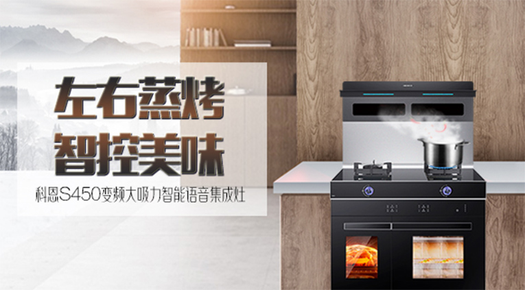 科恩S450左右蒸烤智能語音集成灶全面開啟左烤右蒸新時代,無論你是廚房大廚還是廚房小白,都能一鍵定制蒸烤美食,讓美食如約而至!