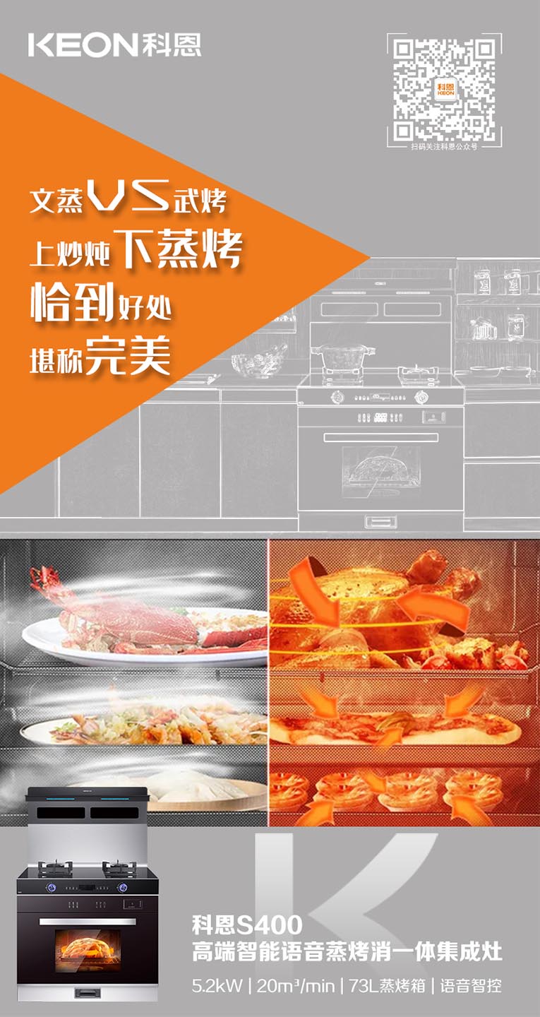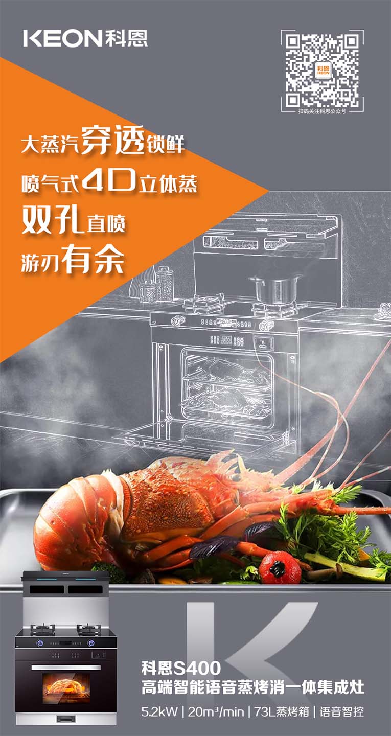 科恩S400蒸烤消一體集成灶,上爆炒下蒸烤,“懶人綜合征”終于有救了!