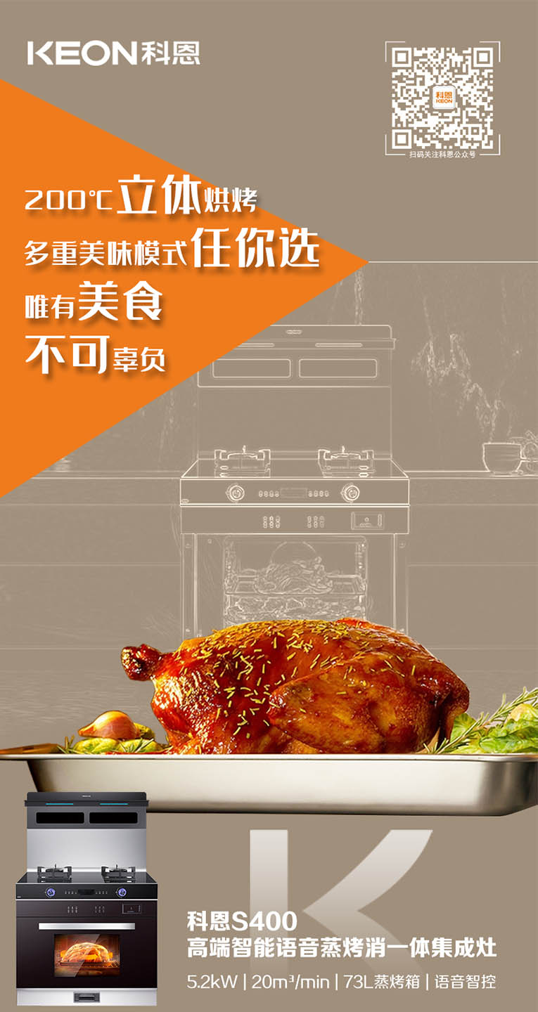 當代年輕人的“懶”癥可謂是人盡皆知,因此烹飪美食時,只求一次搞定!有效提升烹飪效率,集成灶十大品牌、廚電行業十大品牌科恩S400變頻大吸力蒸烤消一體集成灶上下平整加熱加右側雙孔蒸汽噴射,迅速升溫,美味加速,四面受熱均勻,營養不流失。