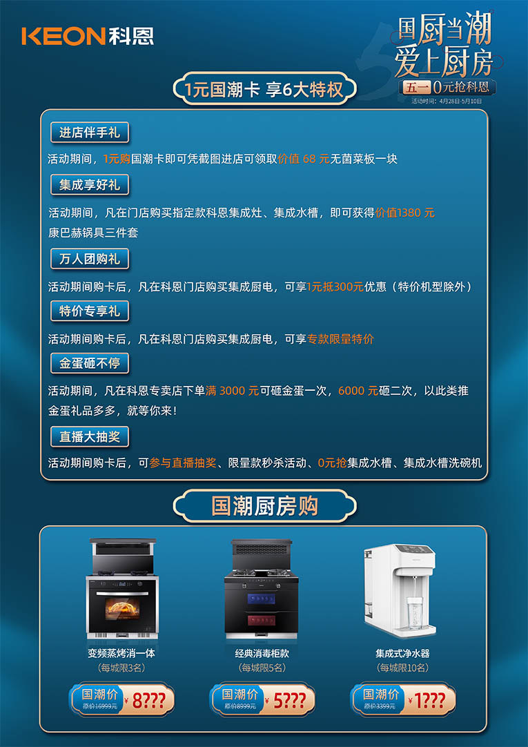 五一黃金周來臨,為了讓千萬家庭享受“廚房新國潮科恩新三件”帶來的魅力,科恩集成灶持續(xù)發(fā)力,全國聯(lián)動擼起袖子,“國廚當(dāng)潮,愛上廚房”五一0元搶科恩,4月28日-5月10日,進科恩集成灶全國門店,六大特權(quán)傾情放送!
