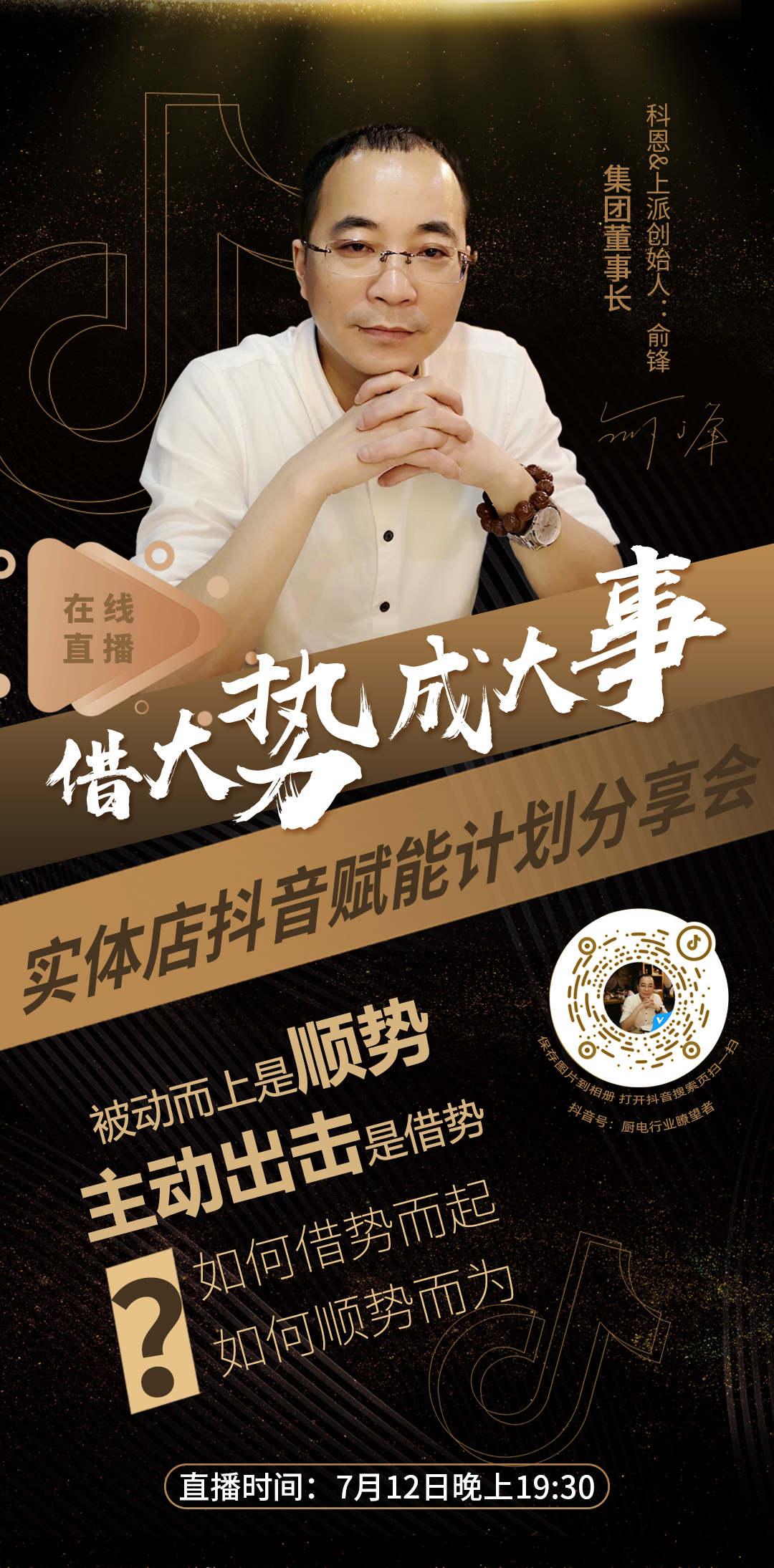 新的時代已然來臨,人貨場關(guān)聯(lián)重構(gòu),亦將是另一個江湖的開啟,你愿不愿意成為那個勇闖天涯,重構(gòu)江湖秩序的領(lǐng)路人?7月12日晚上19:30, 鎖定抖音直播間,董事長俞鋒親自掛帥,為您傾情分享流量變現(xiàn)盈利密碼!