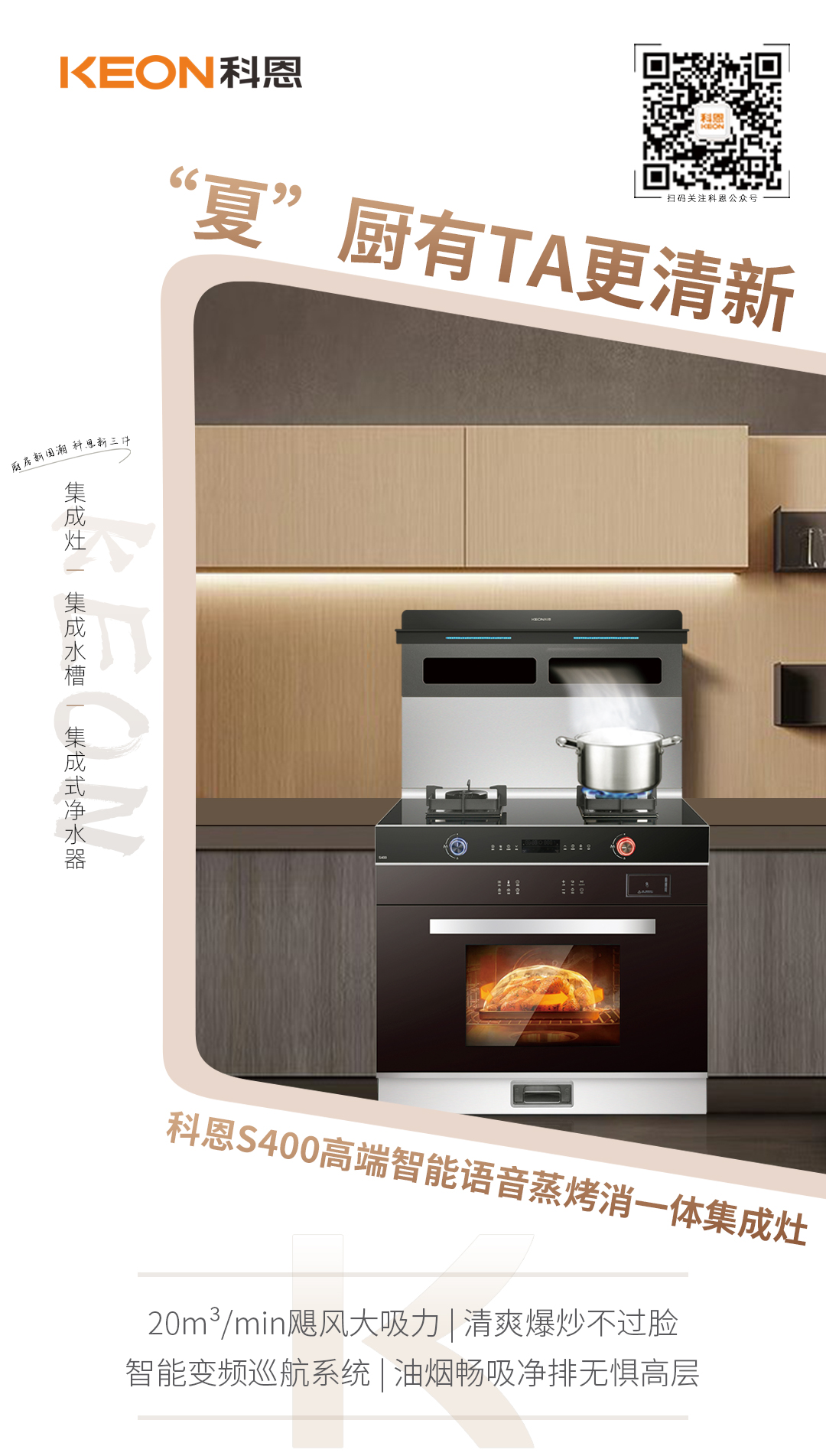 每一次下廚時的揮汗如雨,都是對愛的最好詮釋!科恩S400高端智能語音蒸烤消一體集成灶,20m3/min颶風(fēng)大吸力,720Pa大風(fēng)壓,瞬吸惱人油煙,清爽爆炒不過臉,當(dāng)熱浪遇見清風(fēng),悶熱煩躁一吹就散了,只留下如春風(fēng)細(xì)雨般溫然如潤,智能變頻巡航系統(tǒng),化身“斗暑圣戰(zhàn)士”,油煙暢吸凈排,無懼高層,烹飪高峰亦可游刃有余,于酷暑中守護(hù)家人的一日三餐!