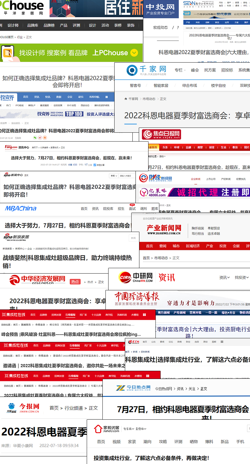 新浪家居、網(wǎng)易家居、太平洋家居網(wǎng)、環(huán)球家電網(wǎng)、廚電行業(yè)資訊、集成灶在線、大眾網(wǎng)、中華網(wǎng)、今報(bào)網(wǎng)、財(cái)經(jīng)新聞網(wǎng)、中國貿(mào)易新聞、經(jīng)濟(jì)發(fā)展網(wǎng)、家電消費(fèi)網(wǎng)、新浪財(cái)經(jīng)頭條、中投網(wǎng)、千家網(wǎng)等幾十家重量級(jí)媒體爭相報(bào)道,2022科恩夏季財(cái)富選商會(huì)內(nèi)容躋身熱門話題,引發(fā)全網(wǎng)轟動(dòng)熱潮,相信本月27日的科恩夏季選商會(huì)必將引爆全網(wǎng),熱力滿滿!