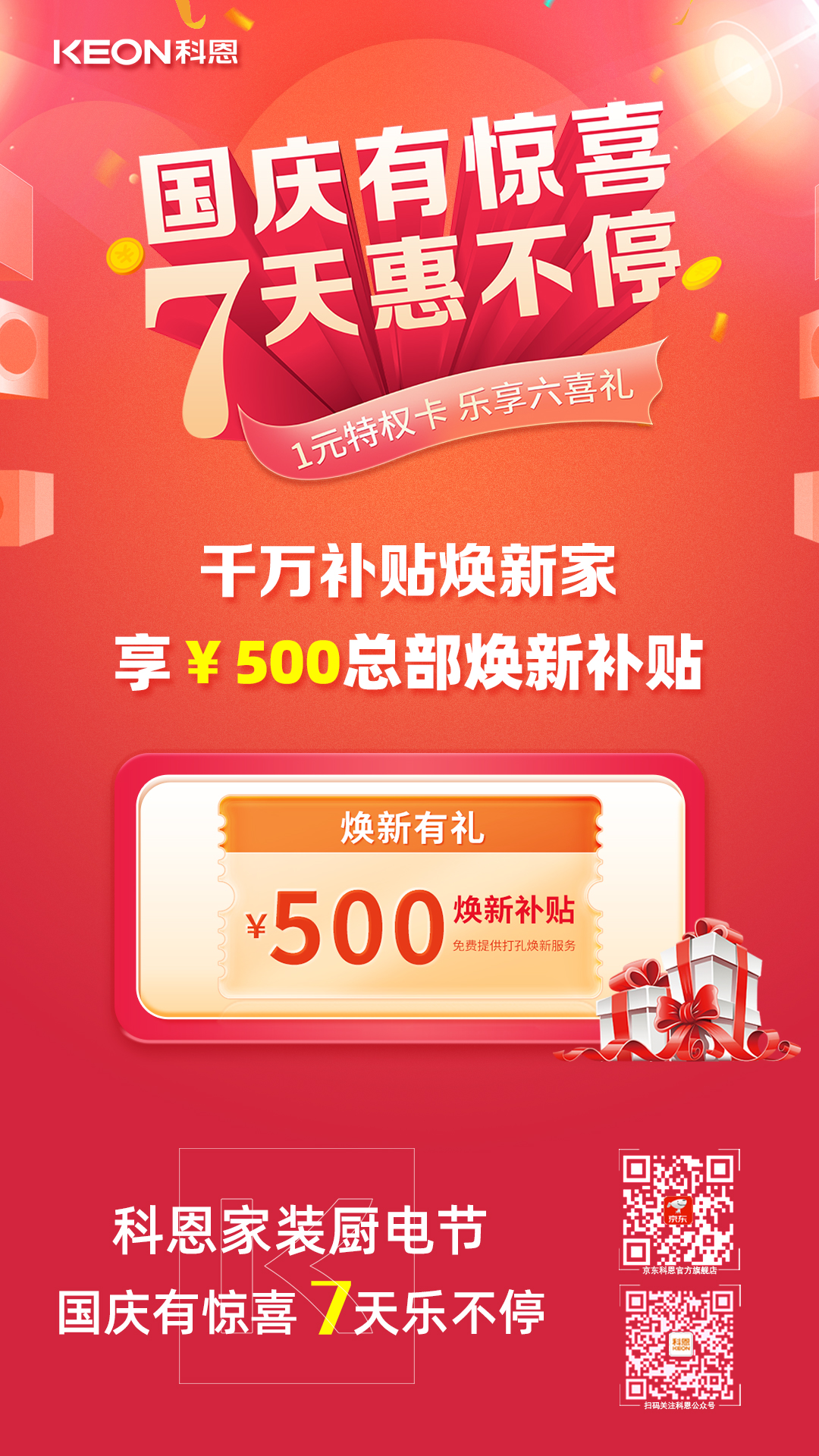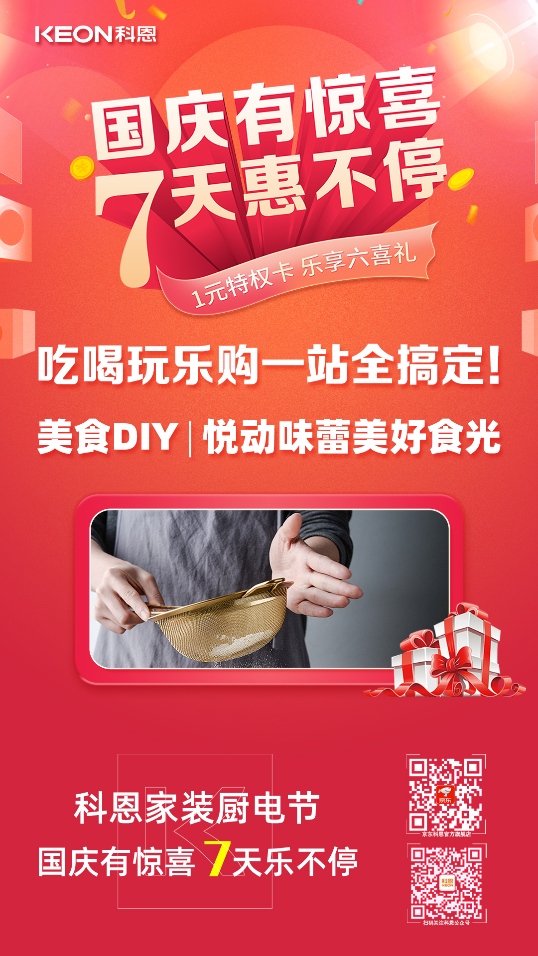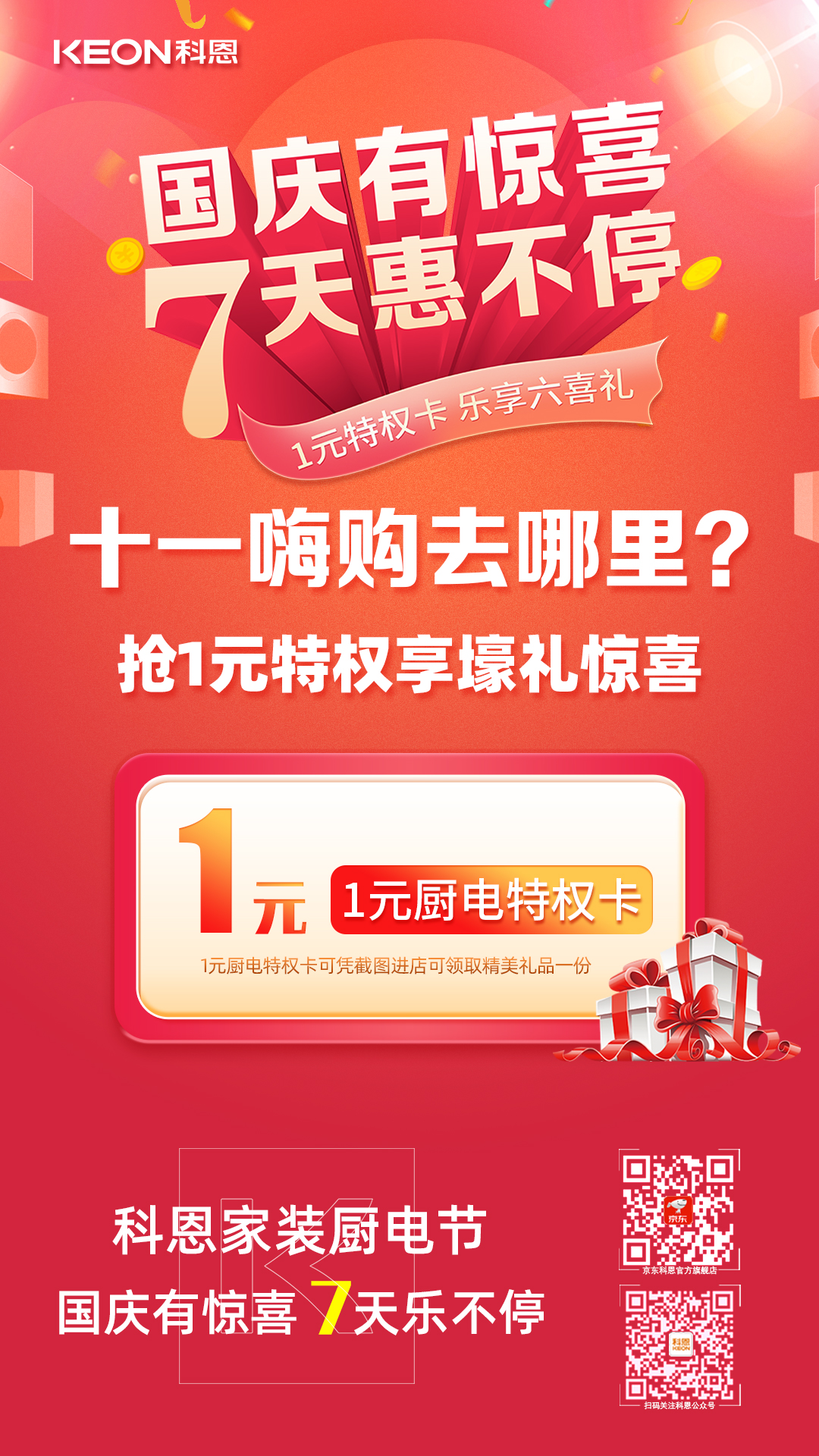 1元瘋搶?zhuān)o力國(guó)慶,科恩家裝廚電節(jié)國(guó)慶專(zhuān)輯——國(guó)慶有驚喜,7天惠不停正火熱進(jìn)行中,力度空前,更有豪華大禮包驚喜贈(zèng)送,全民鉅惠,就在科恩家裝廚電節(jié),更多鉅惠活動(dòng)請(qǐng)?jiān)斣?xún)科恩各大門(mén)店!
