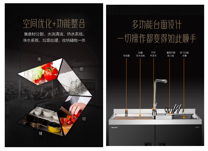 空間優化+功能整合,集食材分割、水洗清潔、熱水系統、凈水系統、垃圾處理、收納儲物于一體,多功能臺面設計,皂液器、加厚實木菜板、萬向水龍頭、通用不銹鋼刀架、手工打磨水槽等功能,每一處細節堪稱完美,整體造型優美別致,同時兼顧實用性。