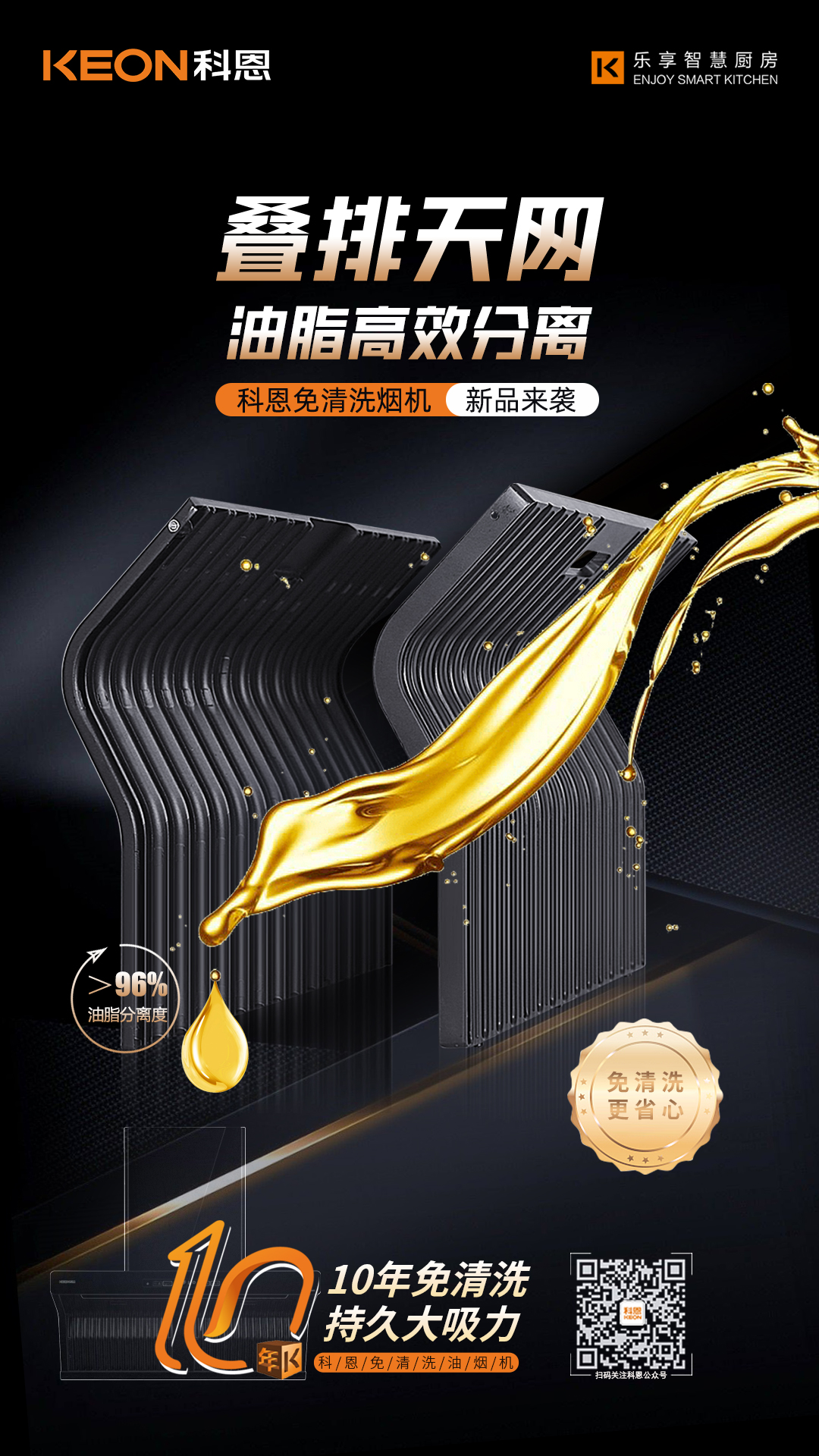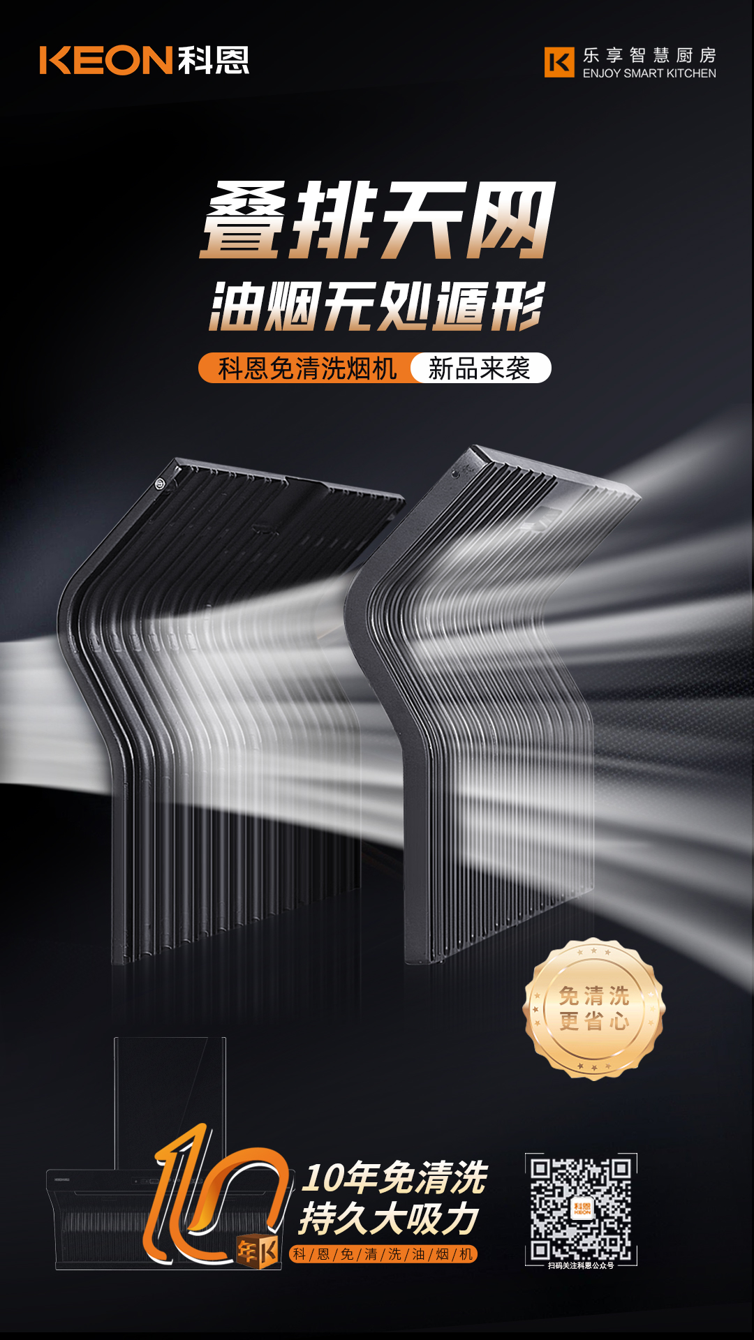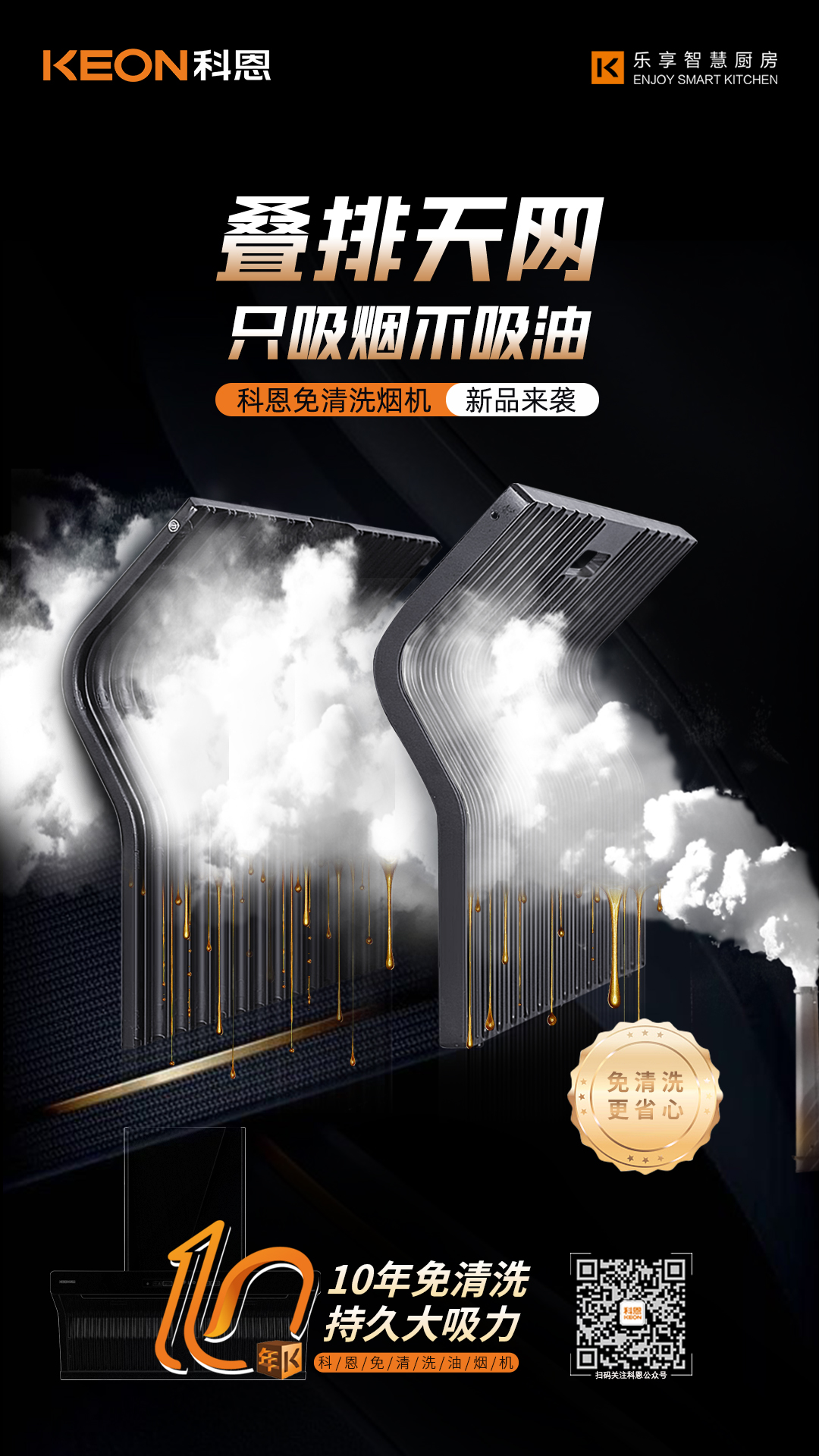 科恩電器歷時3年研發(fā)雙效疊排天網(wǎng),采用易潔太空壓鑄鋁材,經(jīng)過酸洗-噴砂工藝加之特氟龍噴涂最后高溫?zé)Y(jié),不僅不沾油、易清潔更好打理。同時,能好的阻燃阻熱!雙效疊排天網(wǎng)將油煙盡數(shù)隔離在外,真正做到只吸煙不吸油。徹底告別煙機清洗難題。十年免拆清洗,持久大吸力!終于一款替代人類清洗煙機的廚電產(chǎn)品即將面世,讓廚房生活不再油污滿地。