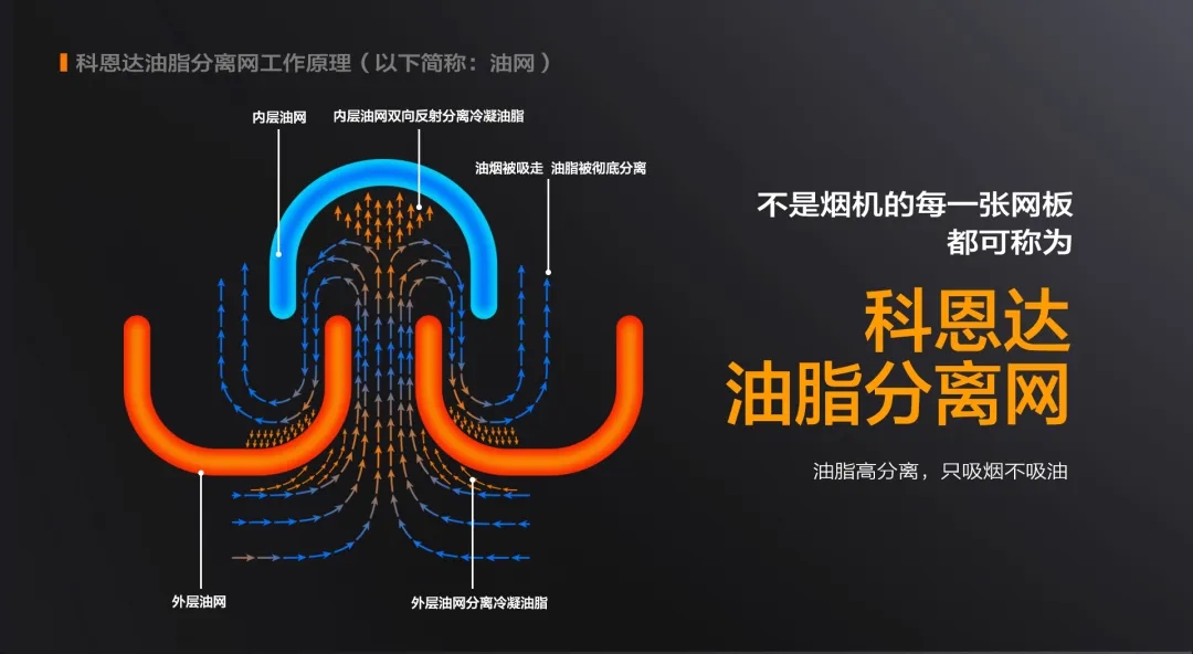 科恩6530免清洗煙機,采用科恩達油脂分離網,真正做到油脂分離,廚房無煙。