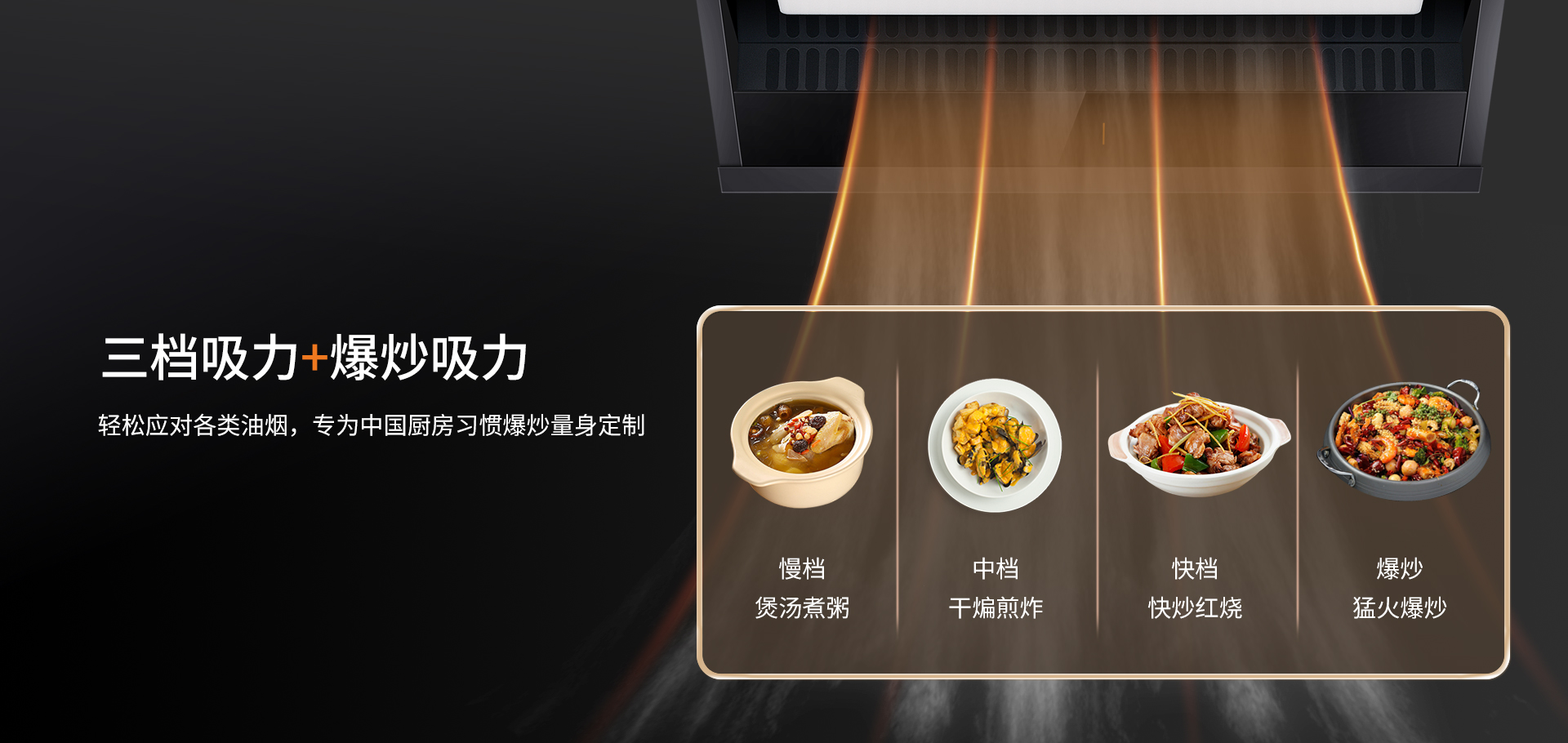 三檔吸力+爆炒吸力,輕松應(yīng)對各類油煙,專為中國廚房習(xí)慣爆炒量身定制。