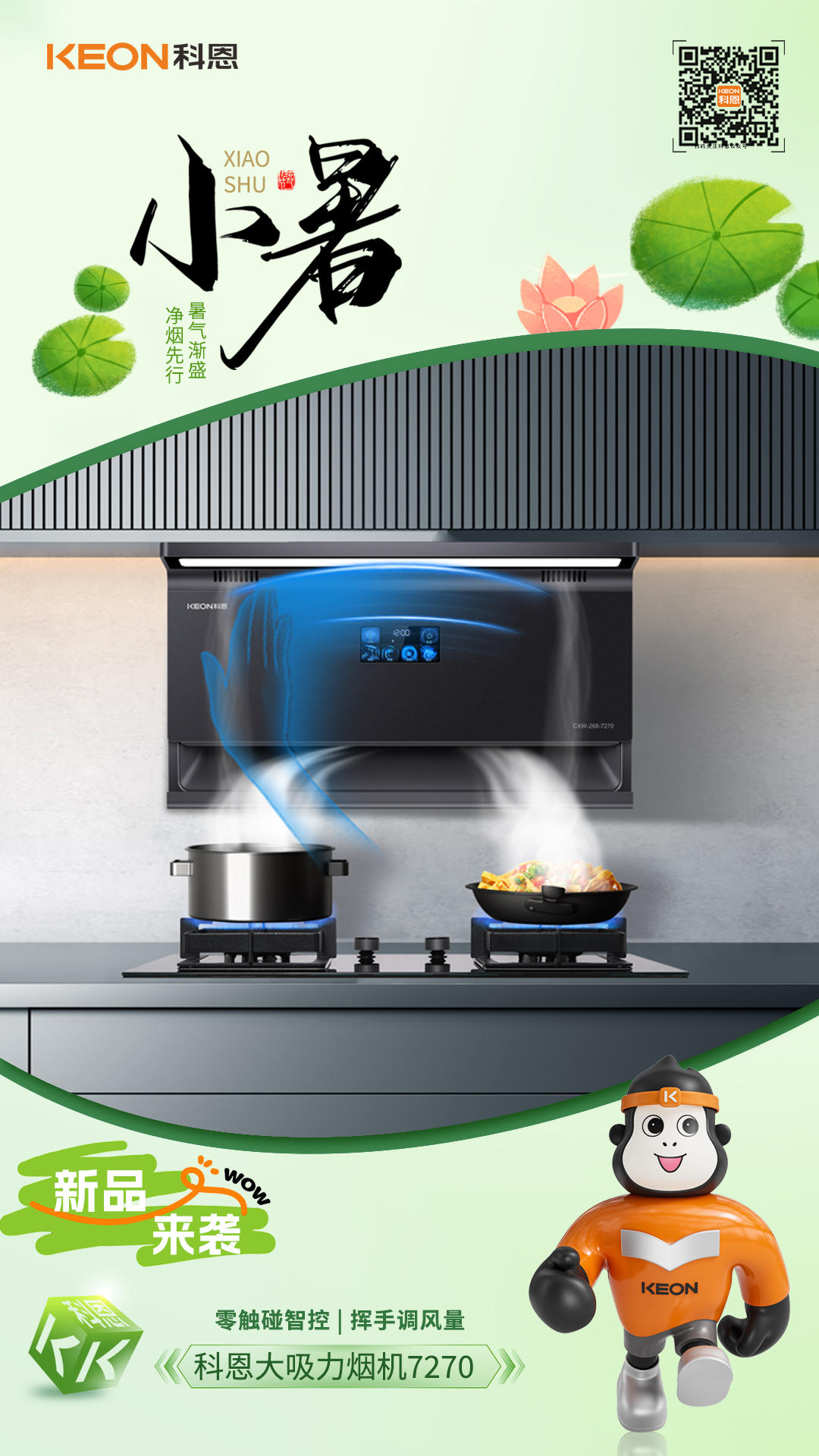蟬鳴初起,熱浪翻涌。小暑時節廚房成高溫重災區,油煙升騰中包裹著暑氣更顯煩躁,科恩7270煙機攜25m³/min暴風吸力來襲,為廚房筑起清涼防線,讓凈煙快一步,生活慢享受。